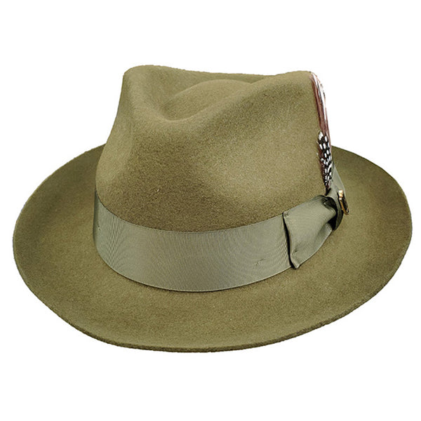 The classic fedora with a wide brim and tear drop crown, the Bruno Capelo Fabio is perfect for dress or casual. Made of a sturdy wool, these items are marked a great low price.