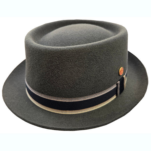 New Arrival! The Mayser Gareth Wool Pork pie is now in stock. This hat has a 1 1/2inch raw edge brim and a 3 1/2inch crown. This item is unlined and has a comfortable cloth sweatband. Don't miss out of this item! Style and warmth at a great price!