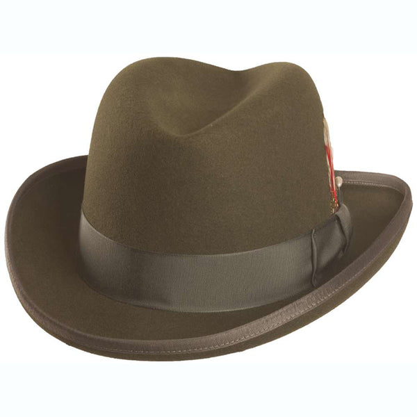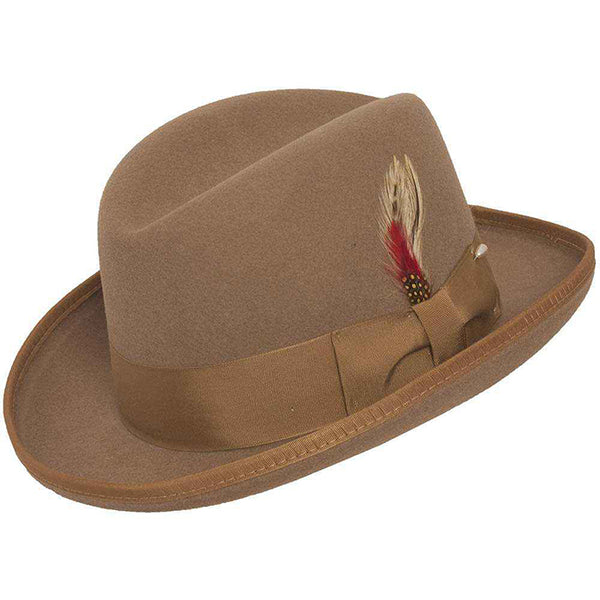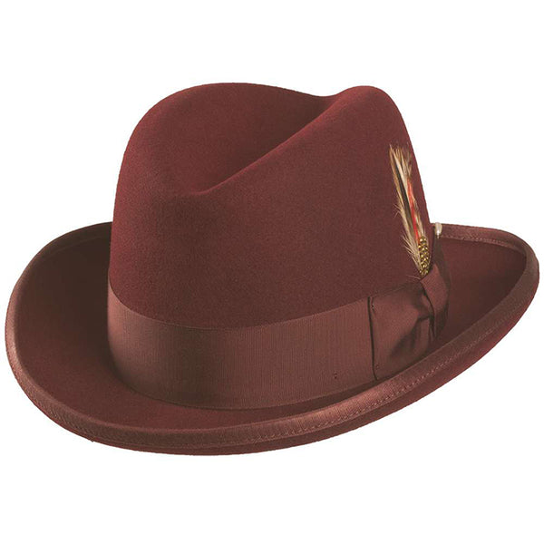 The homburg elevates your look on any occasion. Available in many colors, this dress hat suits any wardrobe. The Godfather’s center-crease crown and wide grosgrain bow band, with matching a bound edge, lend an air of distinction and class. The leather sweatband and satin lining add comfort and protection. This homburg is a quality 100% wool hat at a price you won’t need to form a racket to afford. Made in the USA.